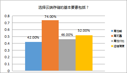 74%调查对象认为,高可靠是云选型的重要因素;52%调查对象认为,运维简便非常重要;46%调查对象认为高性价比是选择云存储的重点;42%调查对象认为高性能是选择云的考量因素。