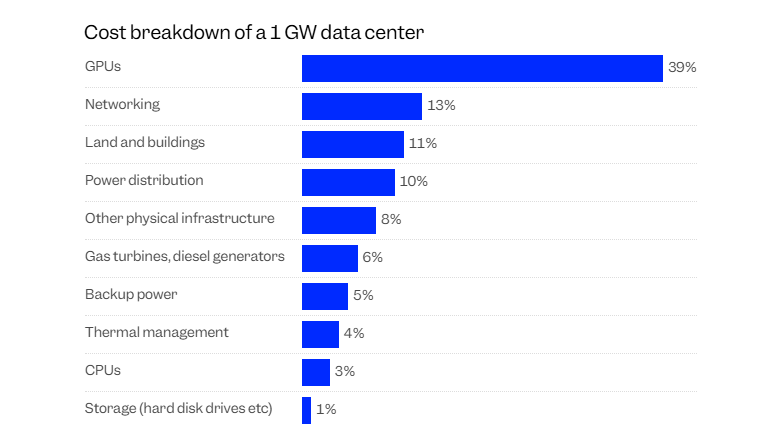 根据Bernstein Research的最新分析,建设1吉瓦AI数据中心的容量成本约为350亿美元。在这350亿美元的1吉瓦数据中心成本中,以下构成至关重要: