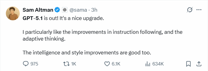 公司CEO萨姆·奥特曼(Sam Altman)也在社交平台X上发帖宣布,“GPT-5.1上线啦!这次升级挺不错的。我特别喜欢它在指令遵循方面的改进,还有自适应思考功能。智能水平和对话风格的提升也挺好。”
