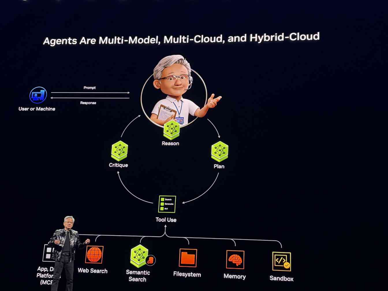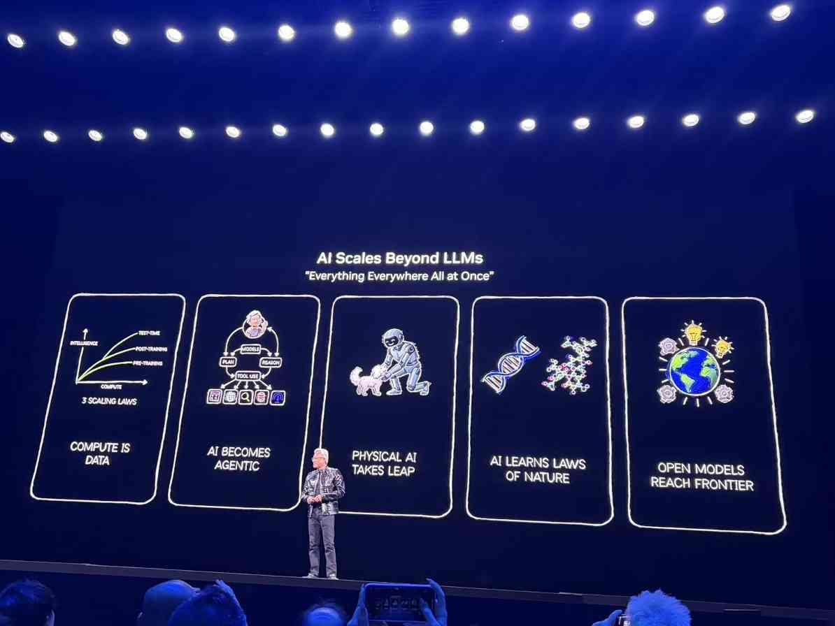 2025年被黄仁勋定义为“智能体系统”普及的元年。AI不再仅仅是预先录制的程序,而是具备推理、规划、甚至在实时运行中进行“思考”的智能体。他特别致敬了中国开源模型DeepSeek R1的突破,认为开源力量正让AI变得无处不在,使智能不再抛下任何人。