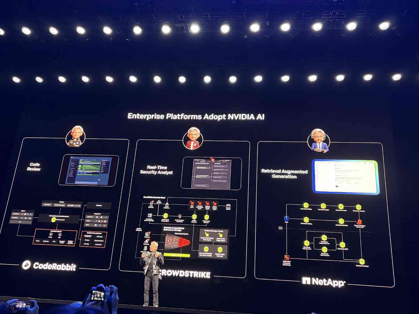 这个基本框架现在正在被整合,而我刚才描述的一切,我们有幸与一些世界领先的企业平台公司合作。例如Palantir,他们整个AI和数据处理平台正在集成,并由英伟达加速。还有世界领先的客户服务和员工服务平台ServiceNow、全球顶级的云端数据平台Snowflake。CodeRabbit,我们在英伟达内部广泛使用。CrowdStrike,正在创建AI来检测和发现AI威胁。NetApp,他们的数据平台现在上面有英伟达的语义AI,以及智能体系统,用于客户服务。
