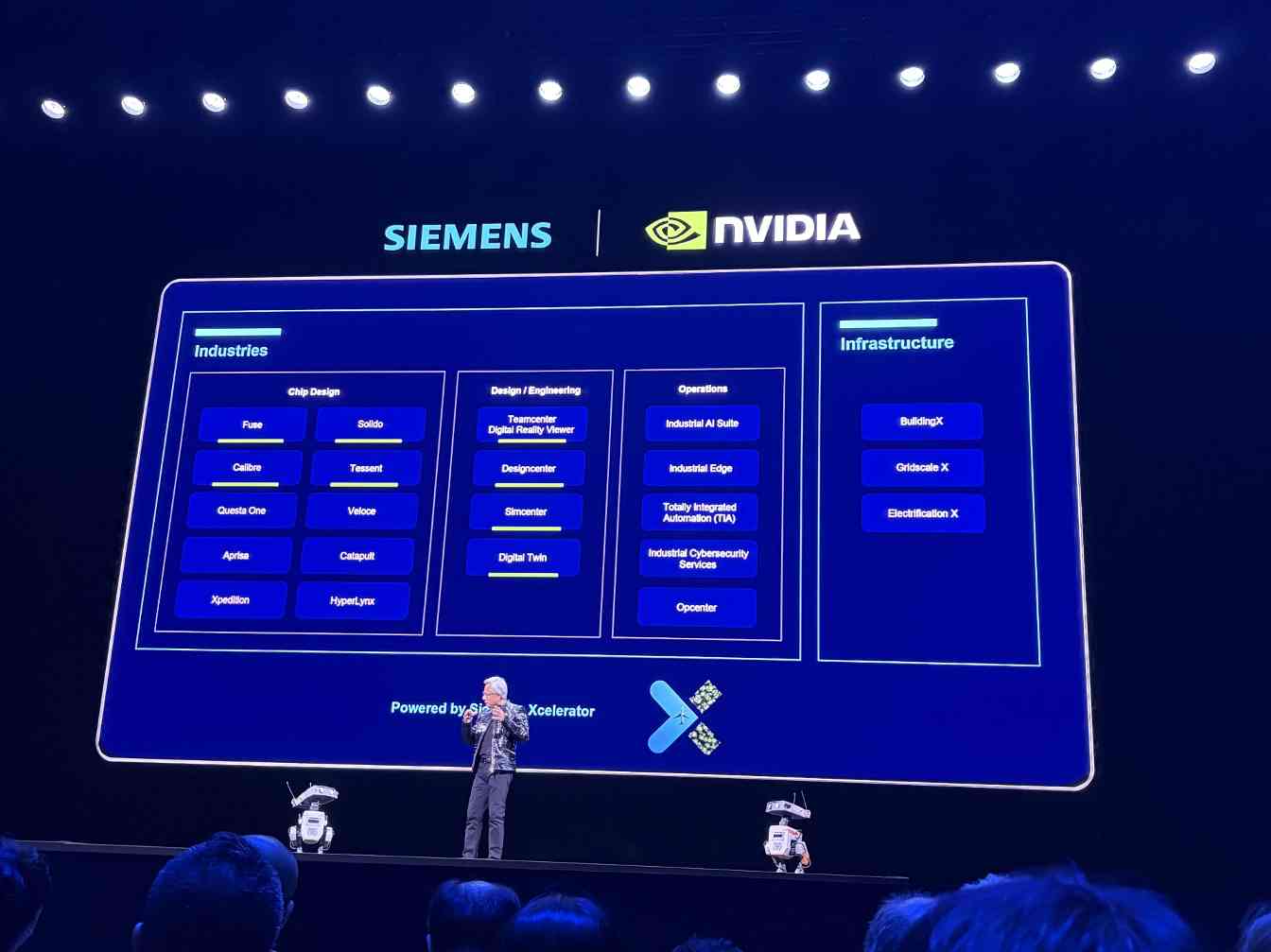 西门子也在做同样的事情。我们将把CUDA-X物理AI、智能体AI、NeMo、Nemotron深度集成到西门子的世界中。原因如下:首先,我们设计芯片,未来这一切都将由英伟达加速。我们将有智能体芯片设计师和系统设计师与我们合作,他们帮助我们进行设计,就像我们今天有智能体软件工程师帮助我们的软件工程师编码一样。