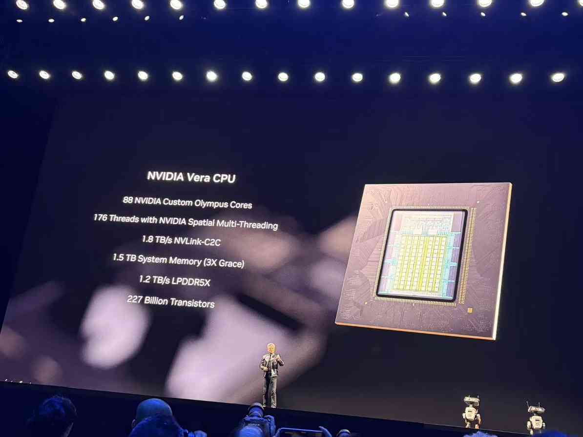 首先是Vera CPU。在一个受功率约束的世界里,它的性能是上一代的两倍,每瓦性能是世界上其他最先进CPU的两倍。它的数据速率是疯狂的,专为处理超级计算机而设计。Grace曾是一款出色的CPU,而Vera则将单线程性能、内存容量和所有方面都显著提升了。这是一次巨大的飞跃。