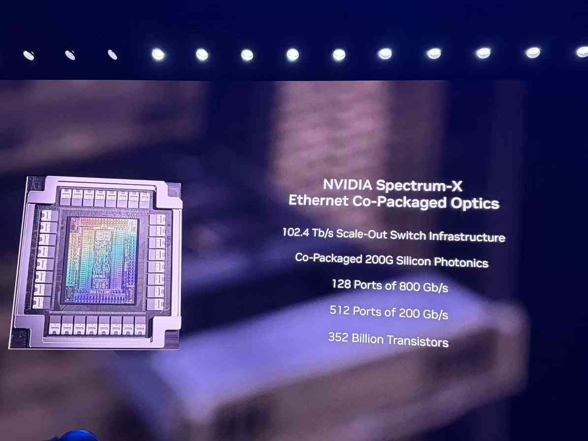 这是世界上第一款采用台积电新工艺制造的芯片,这个新工艺是我们共同创新的,叫做CoWoS,是一种硅光子集成工艺技术。这使我们能够将硅光子直接集成到芯片上。这里有512个端口,每个端口200Gb/s。这就是新的以太网AI交换机——Spectrum-X以太网交换机。