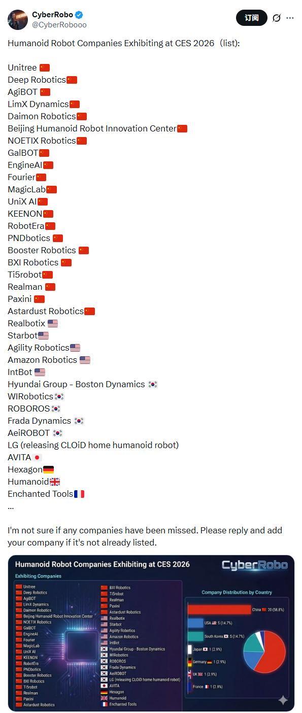 除了宇树,中国厂商正以规模优势发起全线冲击。今年38家人形机器人参展商中,中国占了21家。中国公司将在CES 2026的4119家参展商中占据915家,使中国成为仅次于美国、领先于韩国的第二大参展国