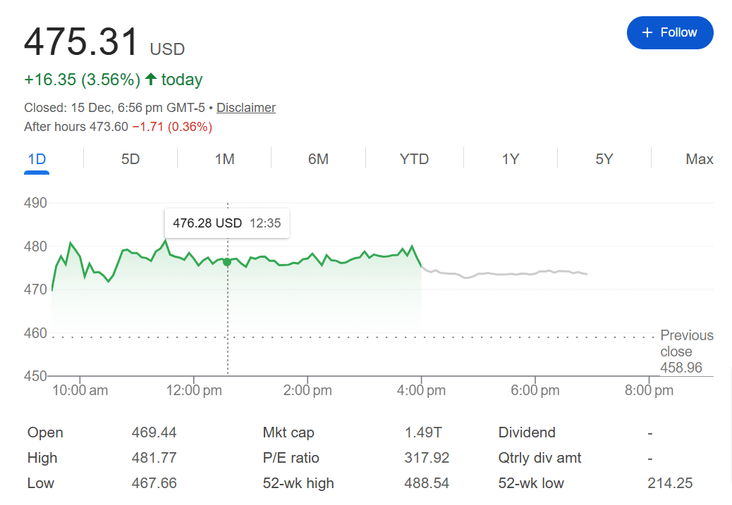 这句话瞬间引爆了资本市场。周一收盘,特斯拉股价飙升3.6%,站上475.31美元的高位,距离2024年12月18日创下的历史最高点仅一步之遥。
