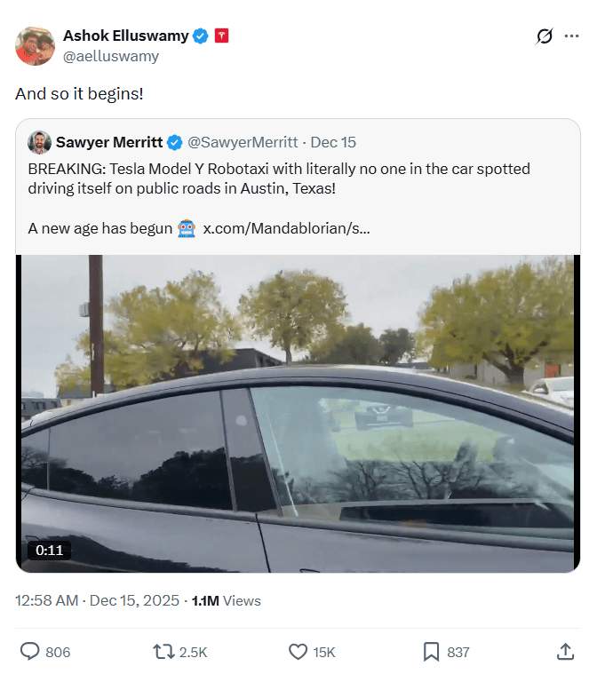 这是特斯拉官方账号在视频流出后一句意味深长的回应。特斯拉AI软件副总裁阿肖克·埃卢斯瓦米(Ashok Elluswamy)更是热烈响应:“就这样开始吧!”