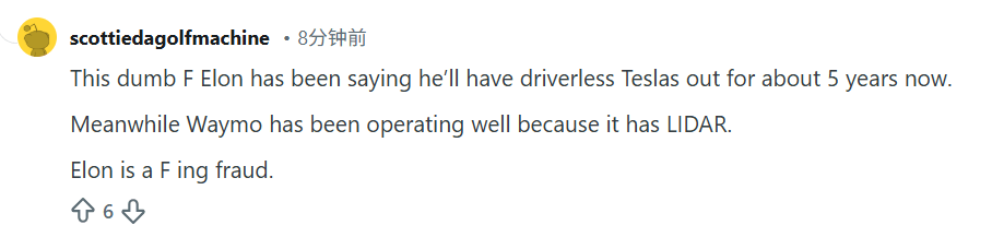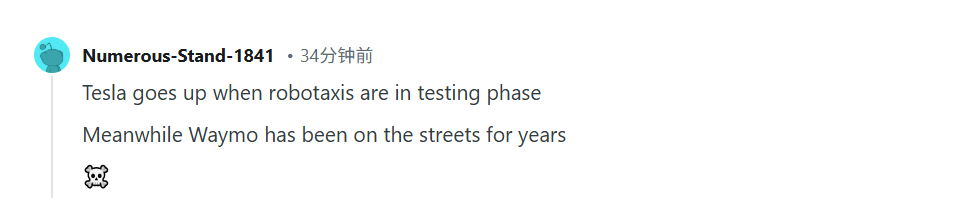 Reddit社区上不少用户也这样认为。有人说,特斯拉机器人出租车还属于测试阶段,要知道Waymo已经在街上跑了好几年了。