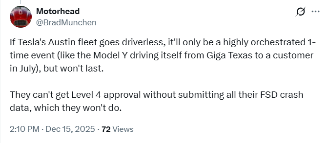 值得注意的是,得克萨斯州的监管将在2026年发生变化。根据参议院第2807号法案,届时自动驾驶运营商将需要获得DMV的商业使用授权——留给马斯克“裸奔”的时间,其实不多了。