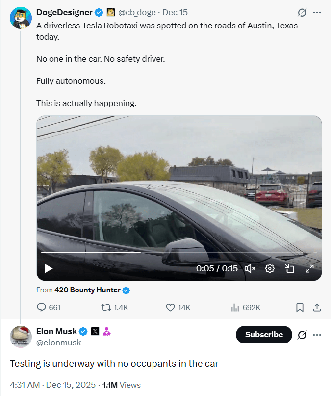 随后马斯克亲自下场确认:“测试正在进行中,车内无乘员。”