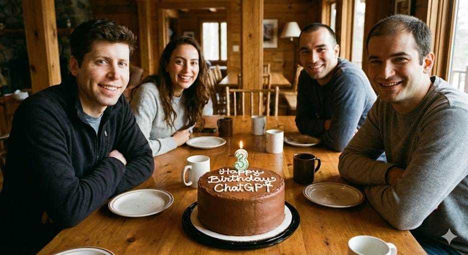 三年后的昨天,奥特曼再次更新动态,颇具仪式感地晒出了ChatGPT的“三岁生日蛋糕”。但这,或许只是暴风眼中的片刻宁静。