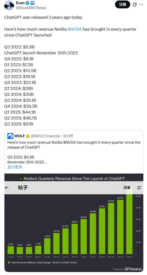 有网友计算发现,自ChatGPT发布以来,英伟达市值几乎翻了十倍,标准普尔500指数增加了24万亿美元,相当于在连续1096天中每天增加220亿美元; 其中微软、苹果、谷歌、亚马逊、Meta等科技巨头的市值更是狂飙突进。