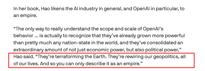 《AI帝国》作者郝珂灵(Karen Hao)直言,OpenAI“已经变得比世界上几乎任何民族国家都更强大”,正在“重构我们的地缘政治和所有生活”。